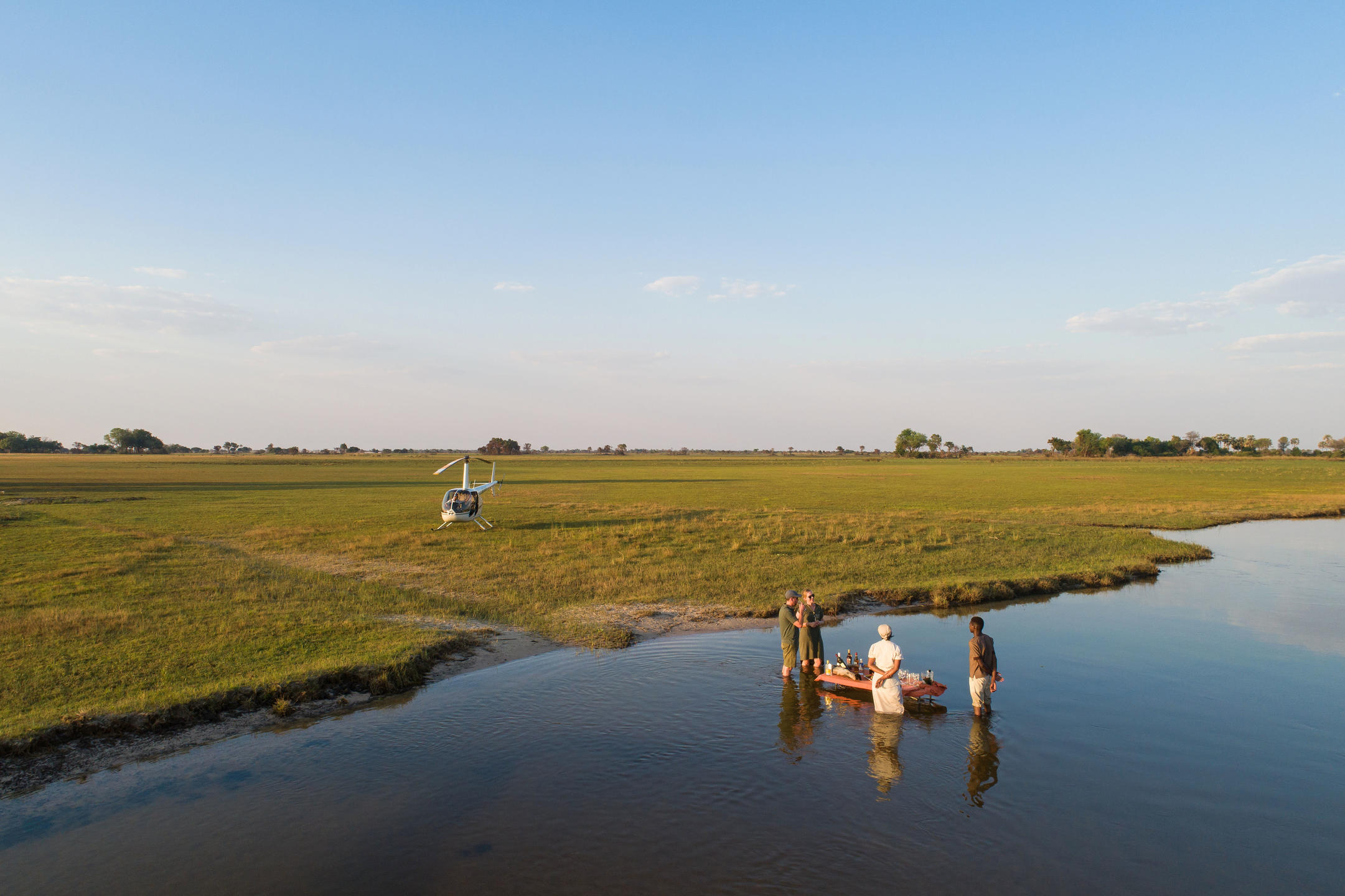 Explore the iconic Victoria Falls with a guided tour, taking in views from both the Zimbabwean and, optionally, the Zambian side. For a truly breathtaking experience, an optional helicopter flight over the Falls offers a panoramic perspective of this natural wonder. The afternoon is reserved for leisure at the lodge, where spa treatments or private relaxation await. As the day draws to a close, enjoy dinner under the stars with sweeping river views.